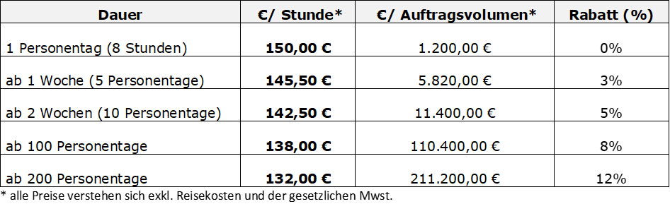 Faire und transparente Geschäftsbeziehungen beinhalten für uns auch eine klare Struktur der Preisgestaltung. Die liefern wir Ihnen mit unserer nachfolgenden Übersicht. Grundsätzlich unterscheiden wir zwischen unserem Stundensatz für Projekte, telefonischer Beratung/ Support und unserem Incident Management (Störfallmanagement) für Bestandskunden.